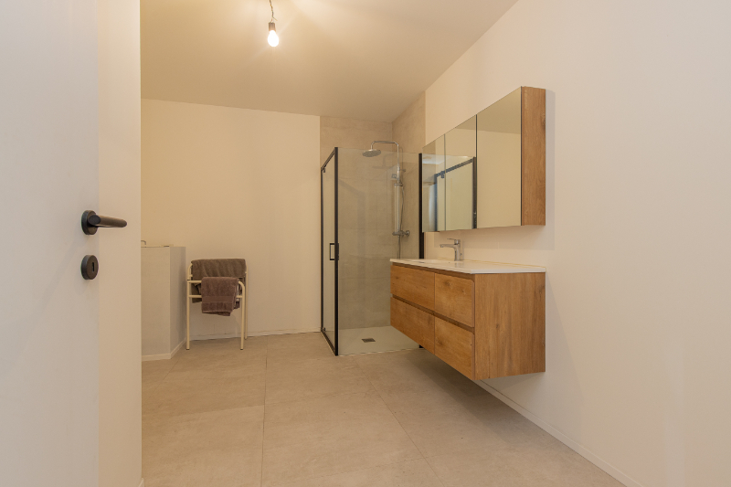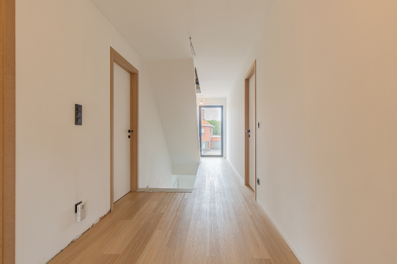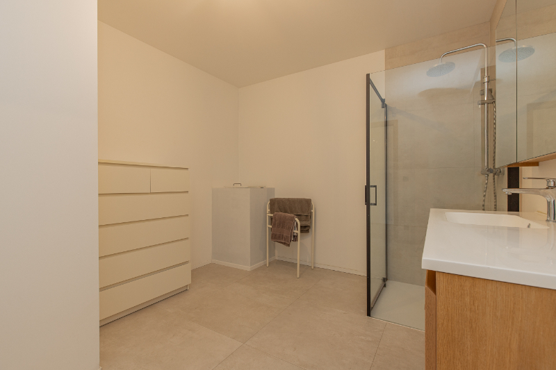 Op de eerste verdieping bevinden zich drie ruime slaapkamers, waarvan één met een zeer ruime dressing. De woning beschikt over twee badkamers: één volledig afgewerkt met douche en een tweede badkamer met voorzieningen voor een bad, dubbele lavabo en dubbele inloopdouche, deze kan u dus nog volledig inrichten naar uw eigen smaak en gevoel. Ook is er een apart toilet en airconditioning aanwezig op deze verdieping.
